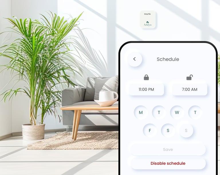 To add to the convenience and ease of use, the GrayTile app allows you to set scheduled timings for arming and disarming your Arklyn Hub so that it keeps protecting you even if you forget to arm it. A typical example would be to set the arming and disarming times to arm the Arklyn Hub automatically at 11 PM in the night and disarm it at 7 AM in the morning.